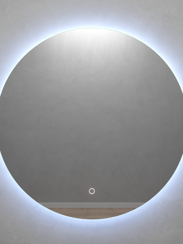 Безрамное зеркало круглой формы с контурной (тыльной) холодной подсветкой, свет 6000К. Подложка из высококачественного МДФ, светодиодная лента защищена матовым свето-рассеивателем от попадания пыли и влаги. Есть вывод 220W для подключения к сети, включение подсветки от сенсорной кнопки на зеркале.